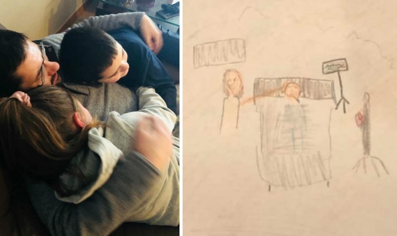 Carson est reçu à la maison après son congé; sur le côté, dessin de la fille: Jésus avec sa main sur la tête de Carson pendant qu’il était hospitalisé.