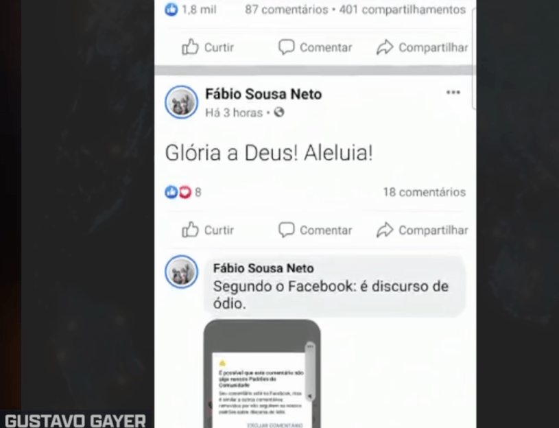 Des internautes brésiliens ont saisi l’ANAJURE (Association Nationale des Juristes Évangéliques), lorsqu’un pasteur a écrit « Gloire à Dieu, Alléluia ! » il a immédiatement reçu une notification de facebook sur cette phrase que la plate forme a jugé être un discours de haine.