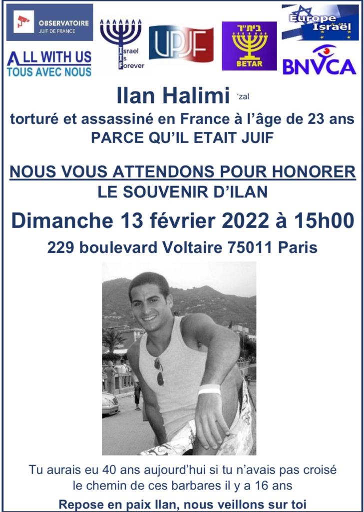 Europe Israël, l’UPJF, Israel is forever, le BNVCA, le Betar, All with us, vous appellent à venir nombreux pour honorer le souvenir d’Ilan Halimi torturé et assassiné sauvagement à l’âge de 23 ans parce qu’il était juif.