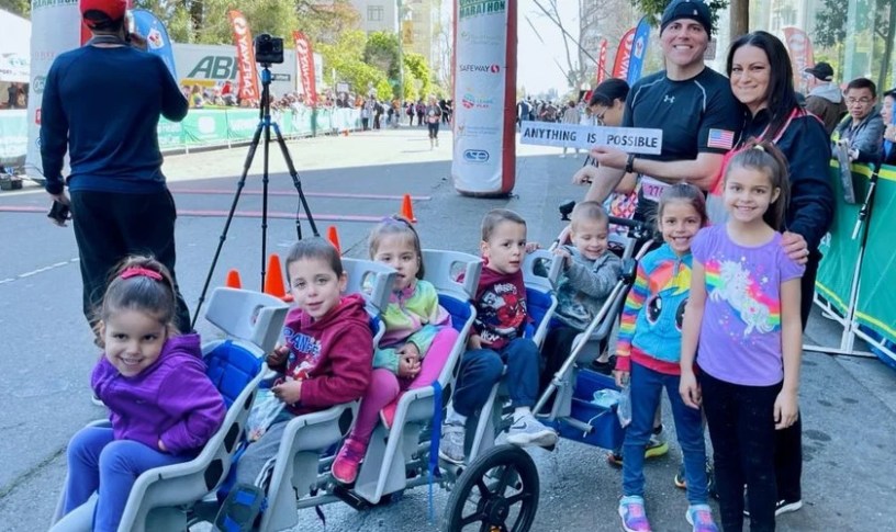 Pour célébrer la santé de ses enfants et honorer sa femme, Chad a commencé à courir des marathons tout en poussant une charrette avec les quintuplés.