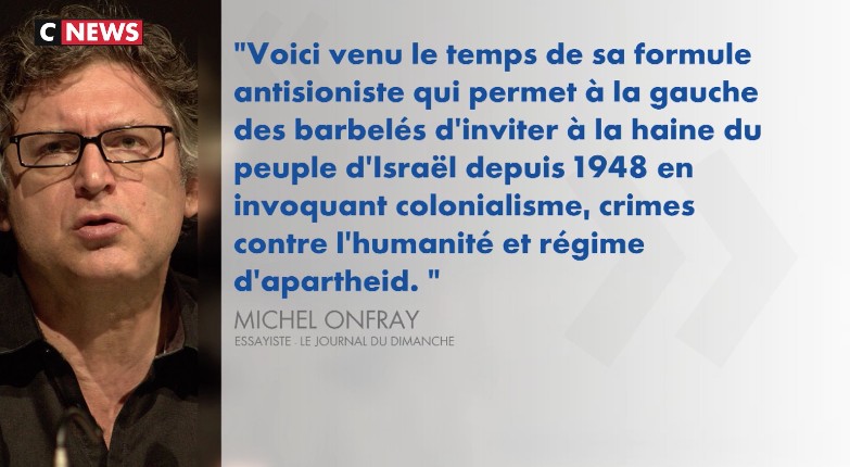 Michel Onfray hier sur Cnews : « Comment peut-on être antisioniste sans être antisémite ? Si on ne veut pas de l’État d’Israël, que fait-on des Juifs qui sont dans l’État d’Israël ? ».