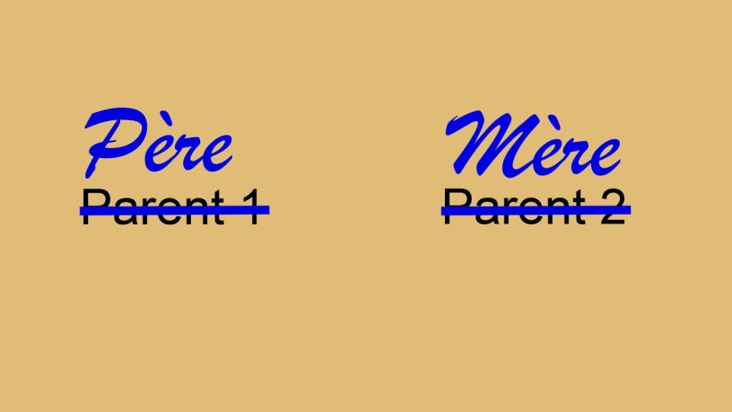 Colette : En France Ce sont dans les formulaires scolaires. Là où était auparavant écrit « père » et « mère », ce sont désormais les mentions « parent 1 » et « parent 2 » qui apparaîtront.