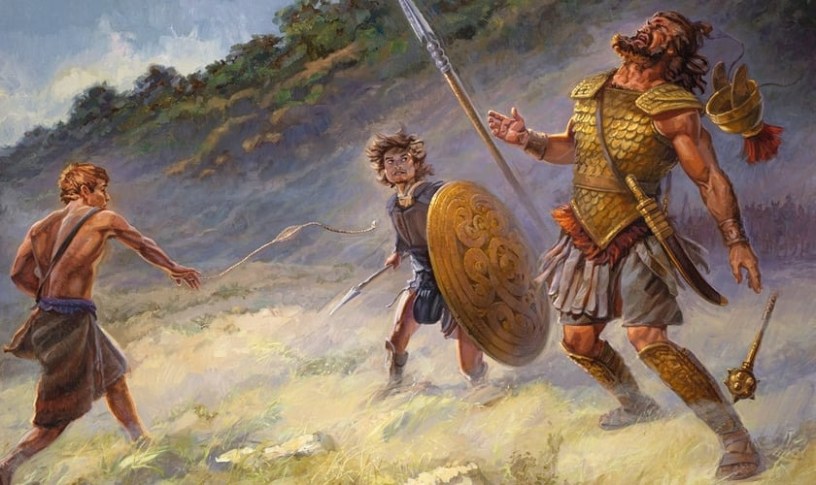 La Bible rapporte que les soldats d’Israël ont été terrifiés devant Goliath pendant quarante jours – David était le seul à vouloir affronter le géant. En voyant ce petit garçon, Goliath se sentit offensé, mais David le défia tout de même :