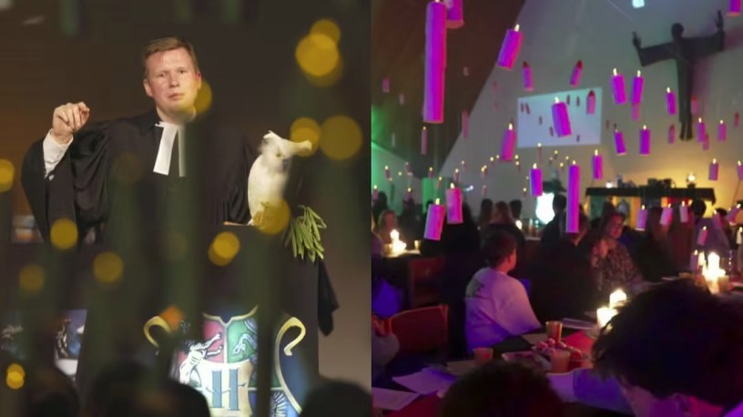 Les participants assistent au service habillés en personnages de l’histoire avec des baguettes magiques et le temple est décoré comme la Grande Salle de Poudlard, avec des bougies et des éléments sombres.
