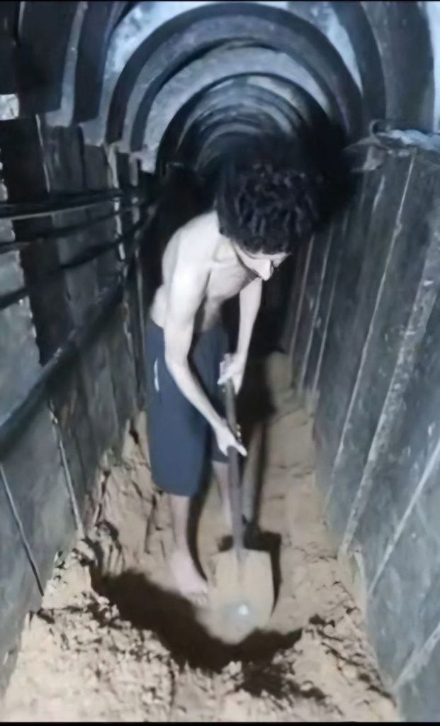 Regardez les images d’Evyatar, jeune homme sain, devenu une silhouette d’os et de peau, forcé de creuser sa propre tombe dans un film sadique tourné par ses bourreaux. Comparez son corps effondré au bras potelé du terroriste qui lui tend une boîte de conserve pour la caméra. Qui est affamé ici ? Qui meurt à petit feu ? Les terroristes du Hamas ? Ou bien Evyatar, et avec lui des dizaines d’autres otages, abandonnés à l’ombre, sous terre, dans une agonie silencieuse depuis 666 jours ?