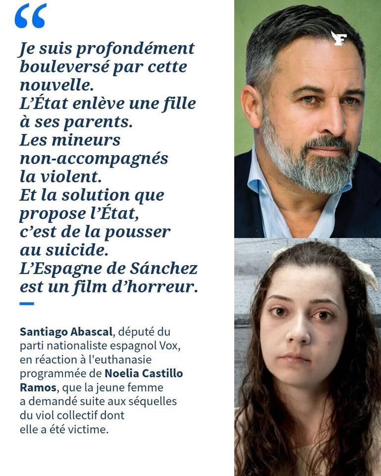 Colette : Ce gouvernement espagnol est tombé sur la tête, en plus d’être antisémite, il euthanasie une jeune fille blessée dans son âme et son corps à cause de la trop grande immigration. Et faire pression sur la famille qui doit êtes dévastée par ce désastre pour récupérer des organes ! Et parler d’euthanasie conformément à la loi espagnole, c’est du délire ! Quand ce gouvernement de gauche, va t’il s’arrêter ??
